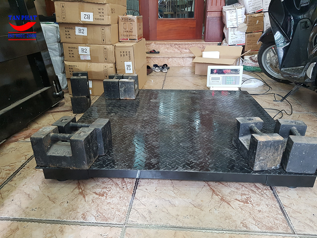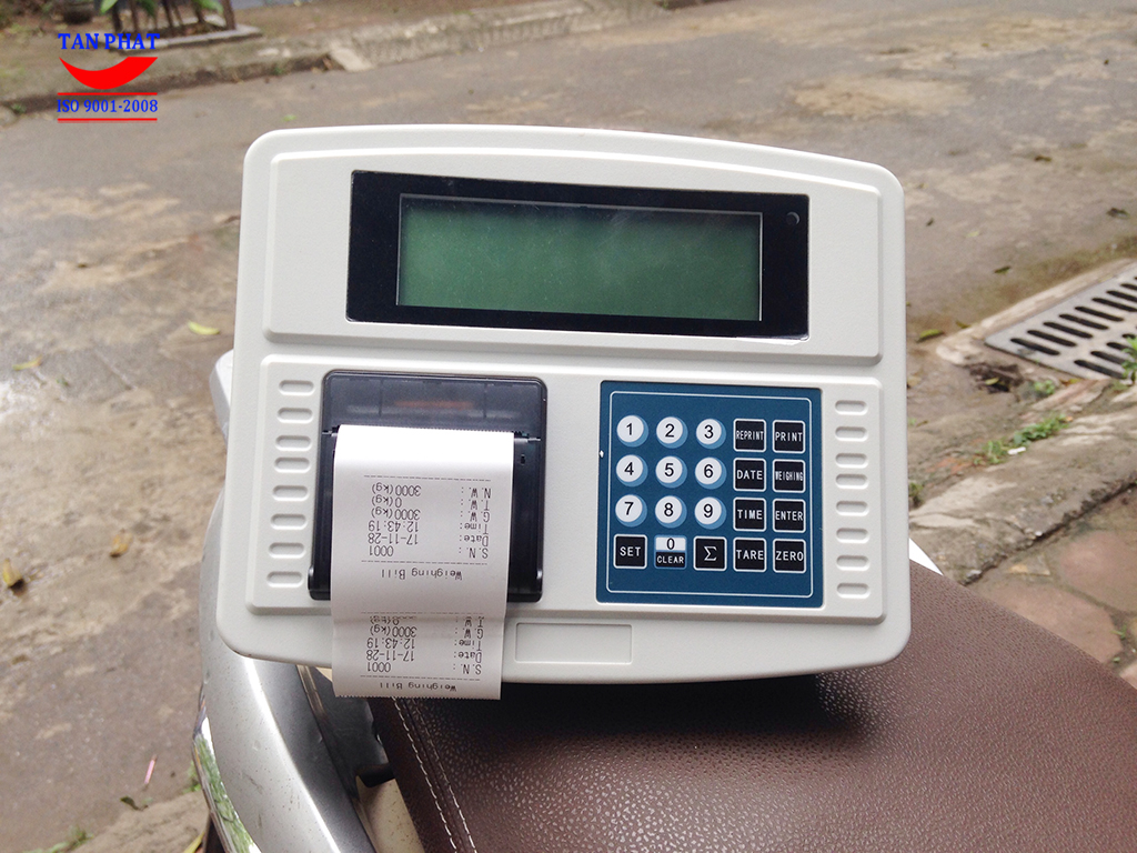 Hình ảnh thực tế cân sàn điện tử A9-Print đã lắp đặt vào đó loại đầu cân có chức năng in phiếu cân trực tiếp. Hình ảnh được chụp trong quá trình xác định khối lượng chuẩn cho cân ngay tại công ty Tân Phát.