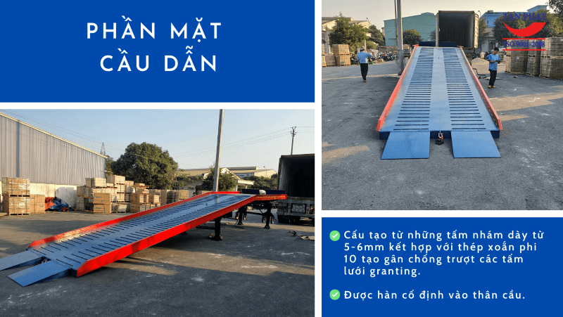 Cầu dẫn xe nâng lên container giúp giảm thời gian bốc xếp hàng hóa lên xuống container một cách tối đa, tăng năng suất làm việc, giảm chi phí thuê nhân công, đảm bảo an toàn hàng hóa,…