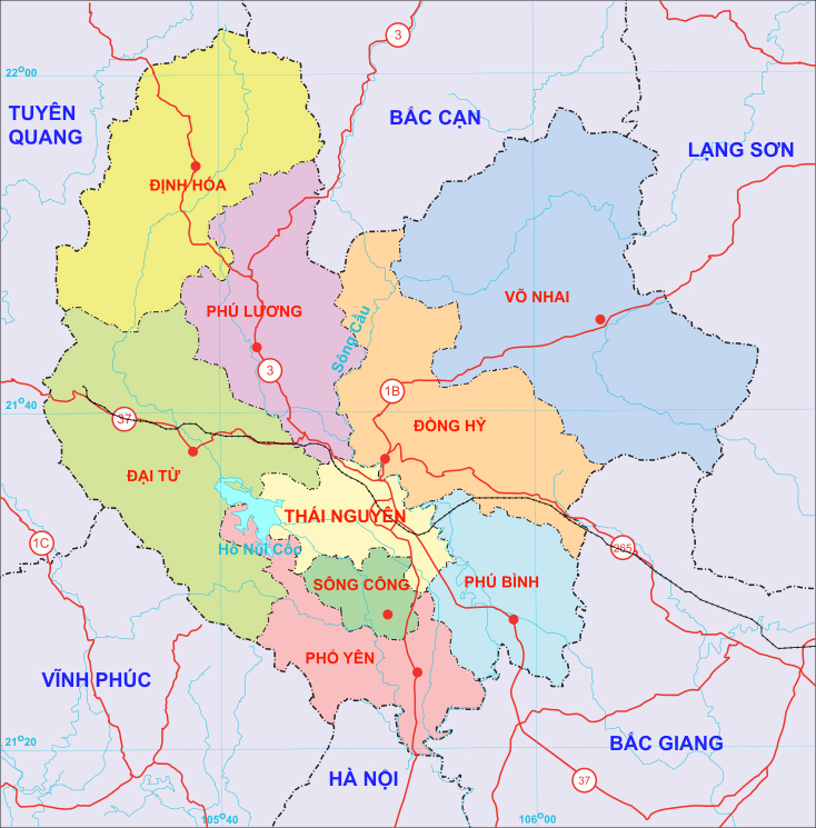 Là vùng kinh tế công nghiệp phát triển, với rất nhiều khu công nghiệp, cụm công nghiệp, kho bãi, bến cảng phân bố trên toàn tỉnh. Tỉnh Thái Nguyên được chia thành 2 thành phố, 1 thị xã và 6 huyện. Thành phố Thái Nguyên, Sông Công, Thị xã Phổ Yên, các Huyện gồm có Đại Từ, Định Hóa, Đồng Hỷ, Phú Bình, Phú Lương,Võ Nhai.
