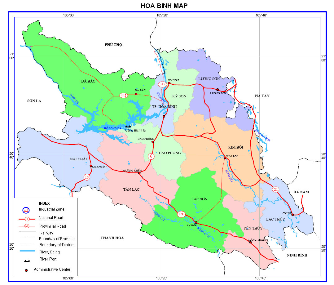 Cũng giống như Ninh Bình và Thanh Hóa, tỉnh Hòa Bình nằm giáp ranh giữa 3 khu vực: tây bắc, đông bắc và Bắc Trung Bộ của Việt Nam. Phía bắc giáp với tỉnh Phú Thọ; Phía nam giáp với các tỉnh Hà Nam, Ninh Bình; Phía đông và đông bắc giáp với thủ đô Hà Nội, Phía tây, tây bắc, tây nam giáp với các tỉnh Sơn La, Thanh Hóa. Tỉnh Hòa Bình hiện có 1 thành phố và 10 Huyện, Trong đó có với 210 đơn vị hành chính cấp xã. Bao gồm có thành phố Hòa Bình, các huyện gồm có huyện Cao Phong, Đà Bắc, Kim Bôi, Kỳ Sơn, Lạc Sơn, Lạc Thủy, Lương Sơn, Mai Châu, Tân Lạc, Yên Thủy. Trên toàn bộ các huyện thành phố Hòa Bình, chúng tôi có phân phối, lắp đặt nhanh nhất trên toàn tinhe. Ngoài hệ sản phẩm cung cấp mới, chúng tôi nhận sửa chữa cân ô tô điệnt ử, bảo dưỡng, nâng cấp, di chuyển trạm câm. Tất cả đều được nảo đảm chất lượng và phí tốt nhất tới tay khách hàng.