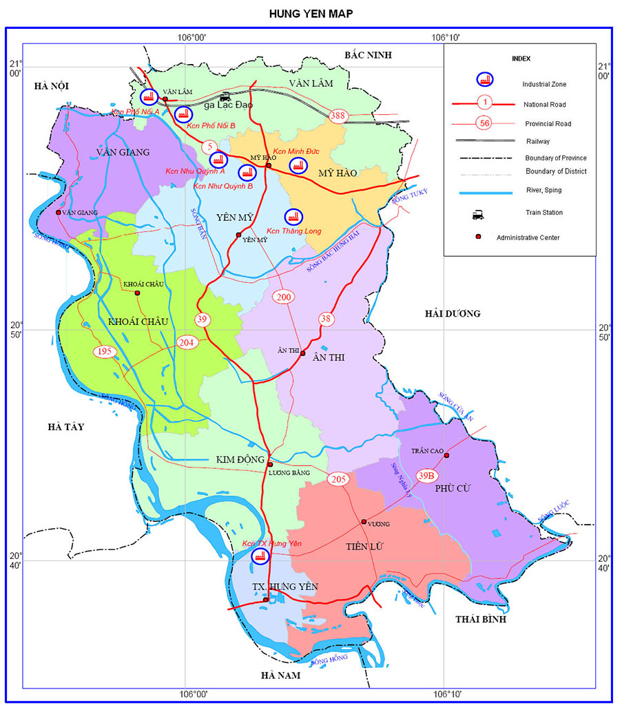 Hưng Yên là một tỉnh nằm ở trung tâm đồng bằng sông Hồng Việt Nam. Trung tâm hành chính của tỉnh là thành phố Hưng Yên nằm cách thủ đô Hà Nội 54 km về phía Tây Bắc, cách thành phố Hải Dương 50 km về phía Đông. Phía bắc giáp tỉnh Bắc Ninh phía đông giáp tỉnh Hải Dương, phía tây và tây bắc giáp thủ đô Hà Nội, phía nam giáp tỉnh Thái Bình và phía tây nam giáp tỉnh Hà Nam.Tỉnh Hưng Yên được phân chia thành 10 đơn vị hành chính: 1 thành phố và 9 huyện, bao gồm 161 đơn vị hành chính cấp xã: 145 xã, 7 phường và 9 thị trấn. trong đó bao gồm Thành phố Hưng Yên, Huyện Ân Thi, Khoái Châu, Kim Động, Mỹ Hào, Phù Cừ, Tiên Lữ, Văn Giang, Văn Lâm, Yên Mỹ.