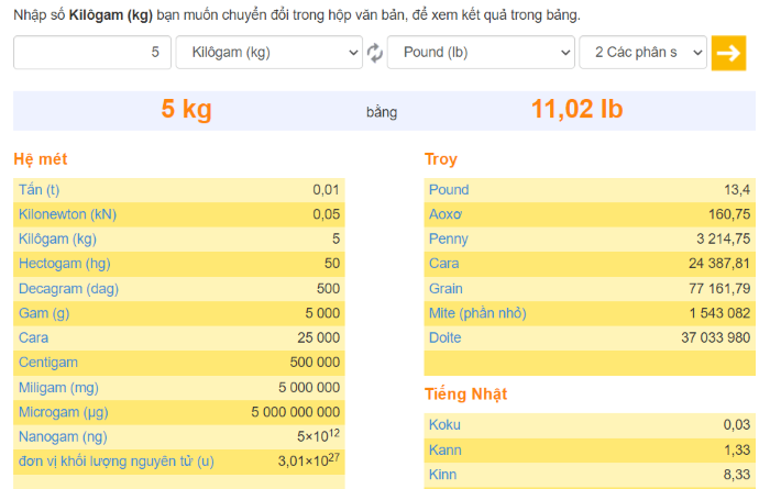 Cách chuyển đổi lbs sang kg bằng công cụ