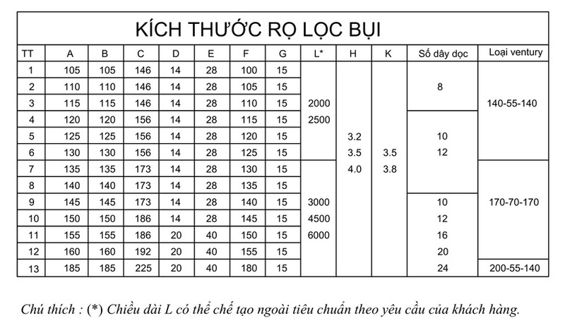 Bảng thông số kỹ thuật chi tiết các loại rọ lọc bụi có thể phù hợp với nhu cầu và hệ thống của doanh nghiệp.