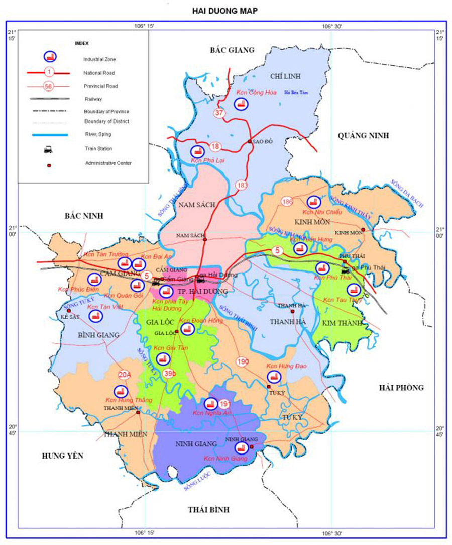Hải Dương là một tỉnh nằm ở đồng bằng sông Hồng, thuộc Vùng kinh tế trọng điểm Bắc bộ, Việt Nam. Trung tâm hành chính của tỉnh là thành phố Hải Dương nằm cách thủ đô Hà Nội 57 km về phía Tây, cách thành phố Hải Phòng 45 km về phía Đông. phía tây bắc giáp tỉnh Bắc Ninh, phía bắc giáp tỉnh Bắc Giang, phía đông bắc giáp tỉnh Quảng Ninh, phía đông giáp thành phố Hải Phòng, phía nam giáp tỉnh Thái Bình và phía tây giáp tỉnh Hưng Yên. Toàn tỉnh Hải Dương bao gồm 01 thành phố trực thuộc, 01 thị xã và 10 huyện. Thành phố Hải Dương, Thị xã, Chí Linh, Huyện Bình Giang, Cẩm Giàng, Gia Lộc, Kim Thành, Kinh Môn, Nam Sách, Ninh Giang, Thanh Hà, Thanh Miện, Tứ Kỳ